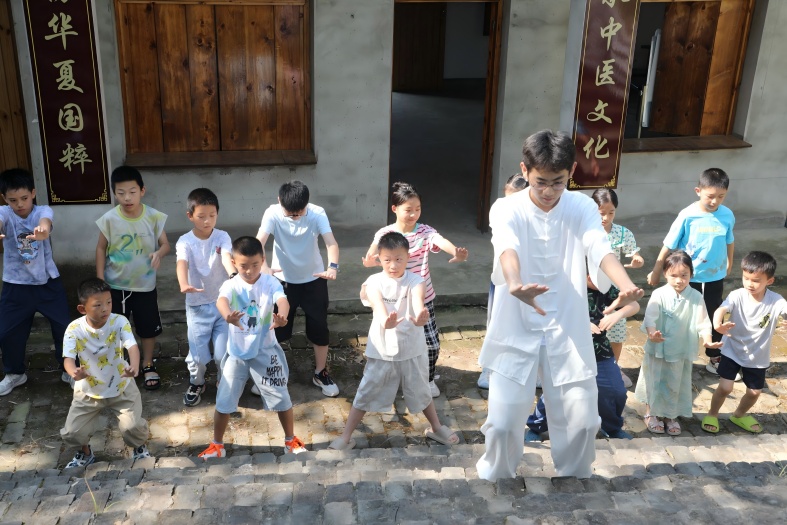 在校园里,实践团成员以通俗语言讲解太极拳的历史渊源与健身价值,以及基础功法的养生原理 ,并带领孩子们上台体验,孩子们虽动作生涩,却个个专注投入。