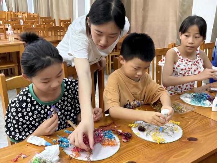 手工制作中药材团扇的环节中,孩子们在实践团成员的指导下,将药材和干花树叶巧妙粘贴在团扇上,让传统药材以创新趣味的形式走进孩子们的视野。