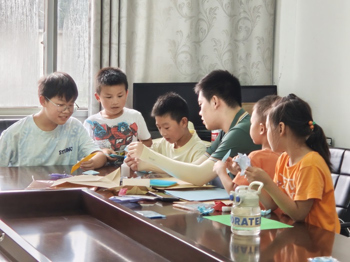 为积极响应乡村振兴战略中“加强农村儿童心理健康服务体系建设”的政策号召,实践团分组行动,通过走访调研当地留守儿童心理状况、组织开展系列主题活动等多种方式,为当地儿童积极乐观健康成长注入“心”能量。活动现场,孩子们整齐的队列与专注的神情,构成夏日最动人的风景。精心设计的互动活动不仅是任务清单的逐项完成,更是生命成长的见证——折纸时迸发的空间想象力、彩蛋画里流淌的色彩感知力、漆扇纹中蕴含的审美创造力,都在悄然滋养着乡村“幼苗”的根系。