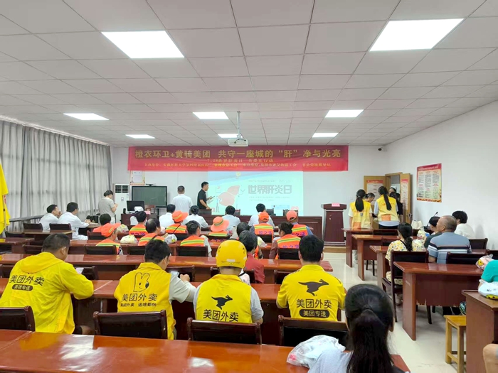 7月28日,第四临床医学院(第四附属医院)的学生志愿者与该院医疗专家一起,走进巢湖市洗耳池社区,为辖区环卫工人、外卖骑手等高危人群普及肝炎防治知识,提供专业化的肝炎防治服务。