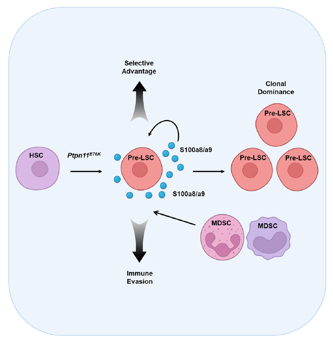 该研究揭示了突变的白血病干细胞中先天免疫反应可异常激活,从而利用先天免疫和炎症机制获得竞争优势,逃避抗肿瘤免疫,促进突变干细胞克隆优势加速白血病进展。这一发现为开发干扰白血病干细胞、改善 JMML 治疗效果的治疗策略提供了重要思路。