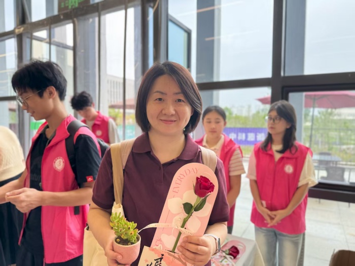 在教室,教师收到同学们准备的小心意——一张新校区主题明信片,明信片背面是美好祝福:“老师,您辛苦了,教师节快乐!”在食堂门口,学生志愿者为前来用餐的每一位教师送上精心设计的节日贺卡和鲜艳的玫瑰,一声声“老师,过节好”,是他们真诚的问候。
